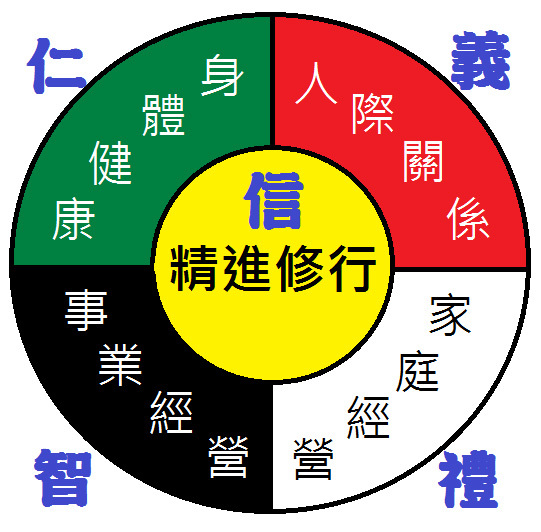 • 義:即公正無私、熱忱待人、見危必救,此為拓展經營人際關係的根本。義能提升自我貢獻與價值,能履行做人的義務,能創造良善的人際關係,因此,應以念無私、行無為、勞無怨、功無居做為待人處事的準則。